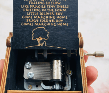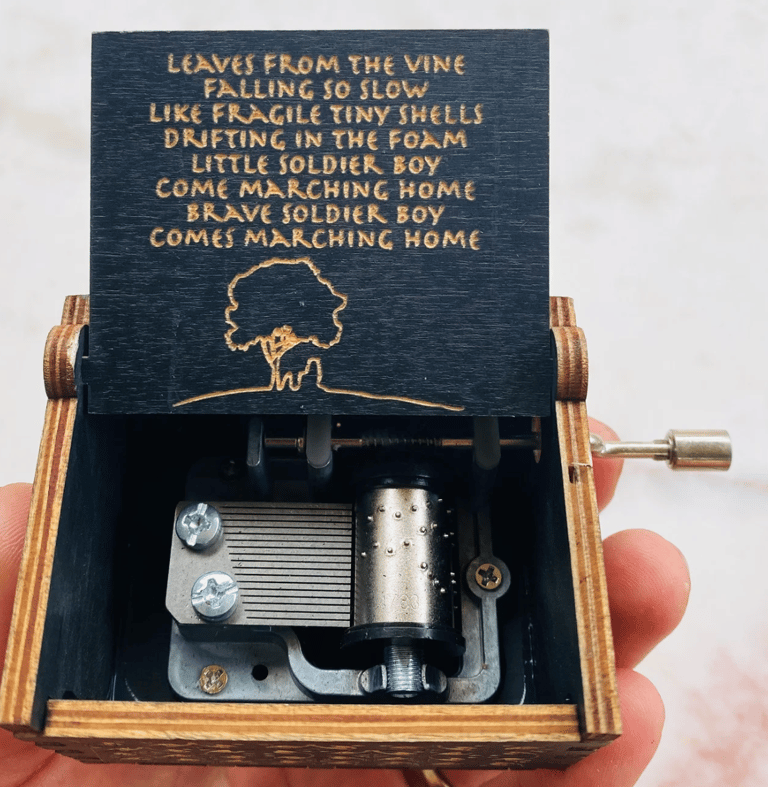After careful deliberation, I chose to bring in a music box that was gifted to me. The music box is fairly simple and has a lid which opens to reveal the mechanical instrument inside as well as the lyrics to the music playing. The song is called "Leaves from the Vine" from my favorite childhood cartoon "Avatar the Last Airbender".