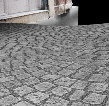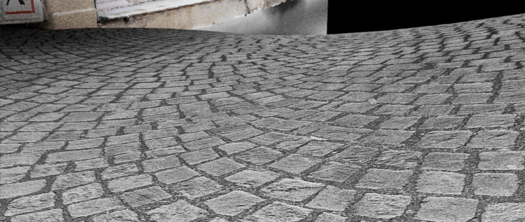 First, the grid I am using to texture (the street geo), must be subdivided several times until it can displace the ground based on the map realistically. After subdividing 9 times, I noticed no change in the render of the cobble. However, I did notice a large increase in render time with the sudden addition of several faces upon the large grid.