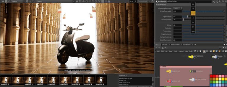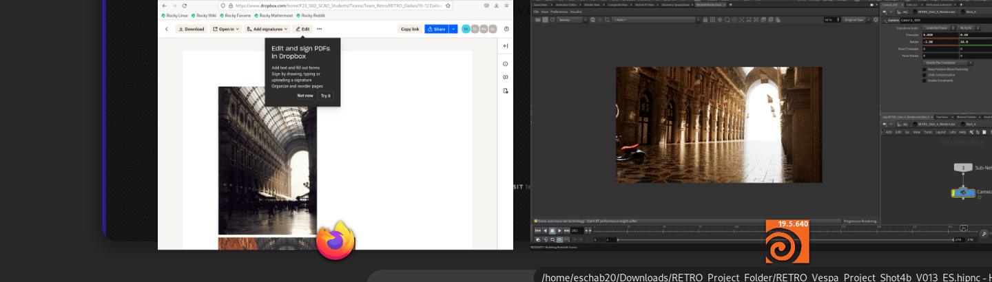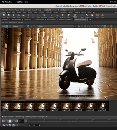 Over the weekend, I spent time going back into shot 4 following the mentors notes about its lighting and its feeling of being disconnected. Specifically, in the previous week the lighting felt different on the vespa then in the environment. I noticed this when working on it in week 5 since the large dome cast the vespa in complete shadow from the light direction. This week, I am not going to use separate lights to light the vespa without any direction.