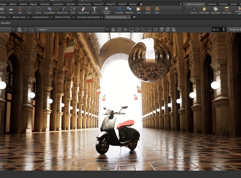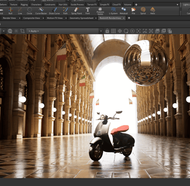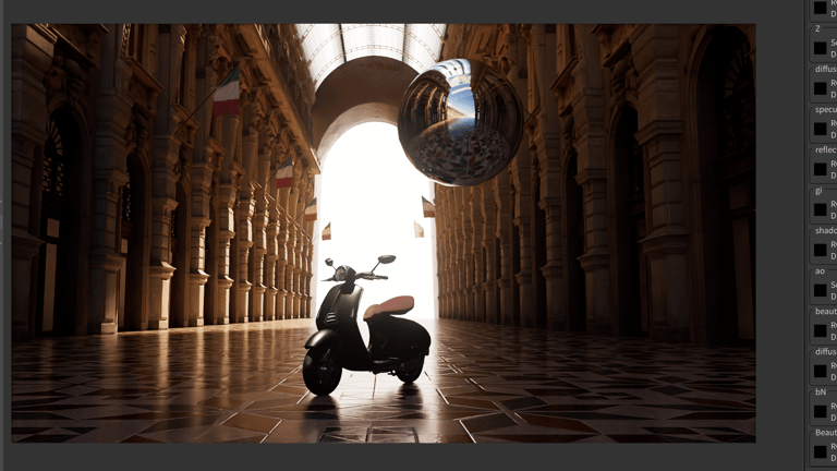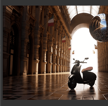To begin, I wanted to keep the direction lighting in the background because of the positive feedback, but somehow get that same lighting to hit the vespa. Since there is a roof above the vespa, I wanted to see how I could use a duplicate of the same light to angle through the roof. This way, it could hit the vespa as if the lighting was coming from that light source above. I used a chrome sphere to aid in seeing the direction of the sky behind me.